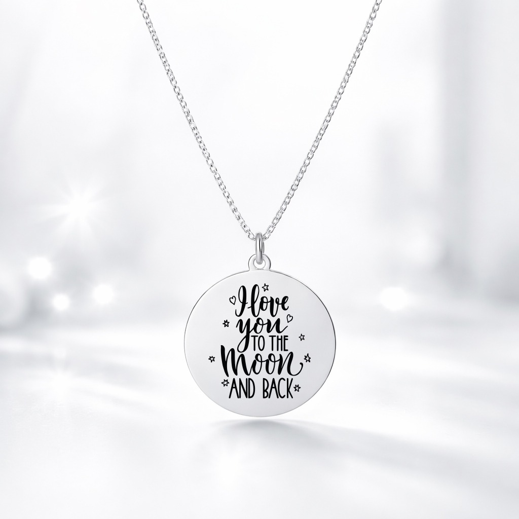 Lănțișor delicat din argint, cu pandantiv tip bănuț de 1,8 cm, gravat cu mesajul „I love you to the moon and back”.