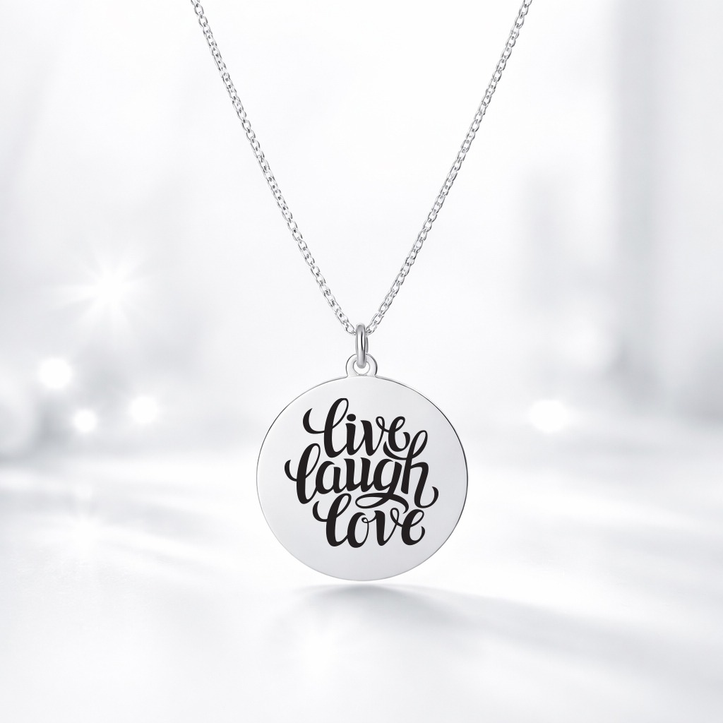 Lănțișor delicat din argint, cu pandantiv tip bănuț de 1,8 cm, gravat cu mesajul „Live, laugh, love”.